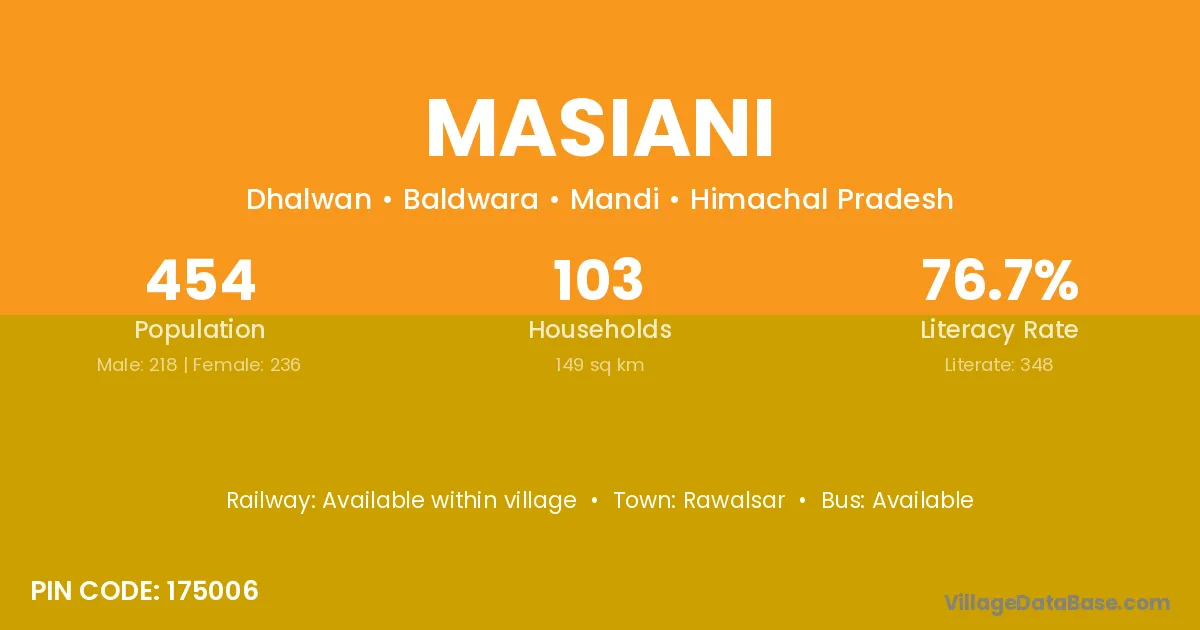 Masiani village has a total population of 454 people, of which 218 are males and 236 are females.