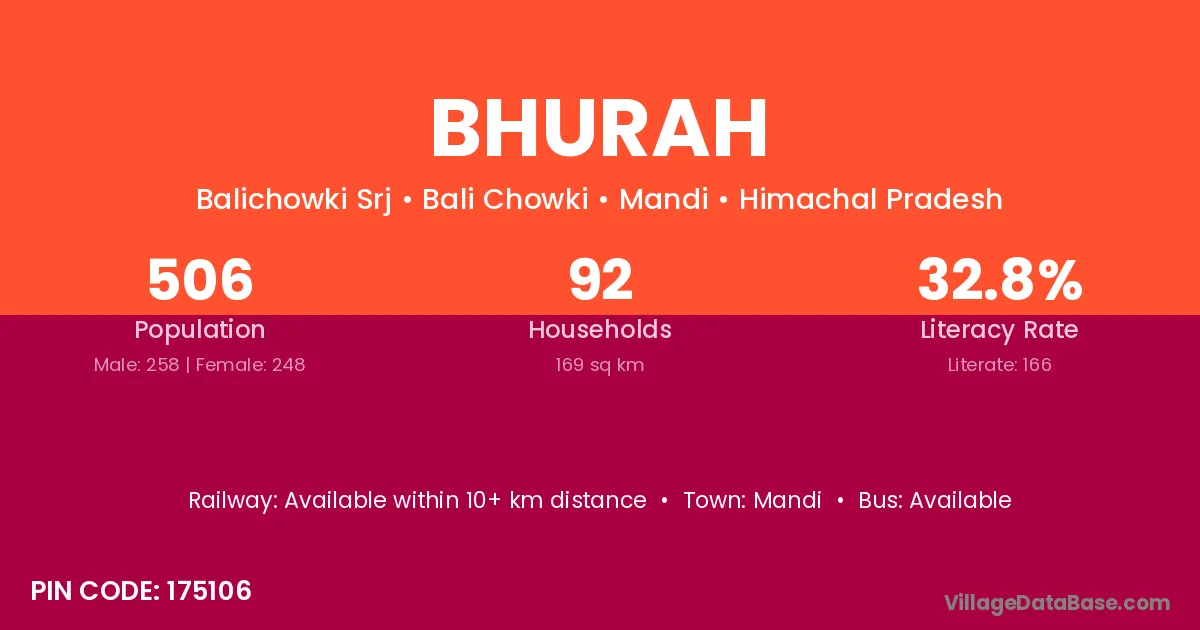 Bhurah village has a total population of 506 people, of which 258 are males and 248 are females.