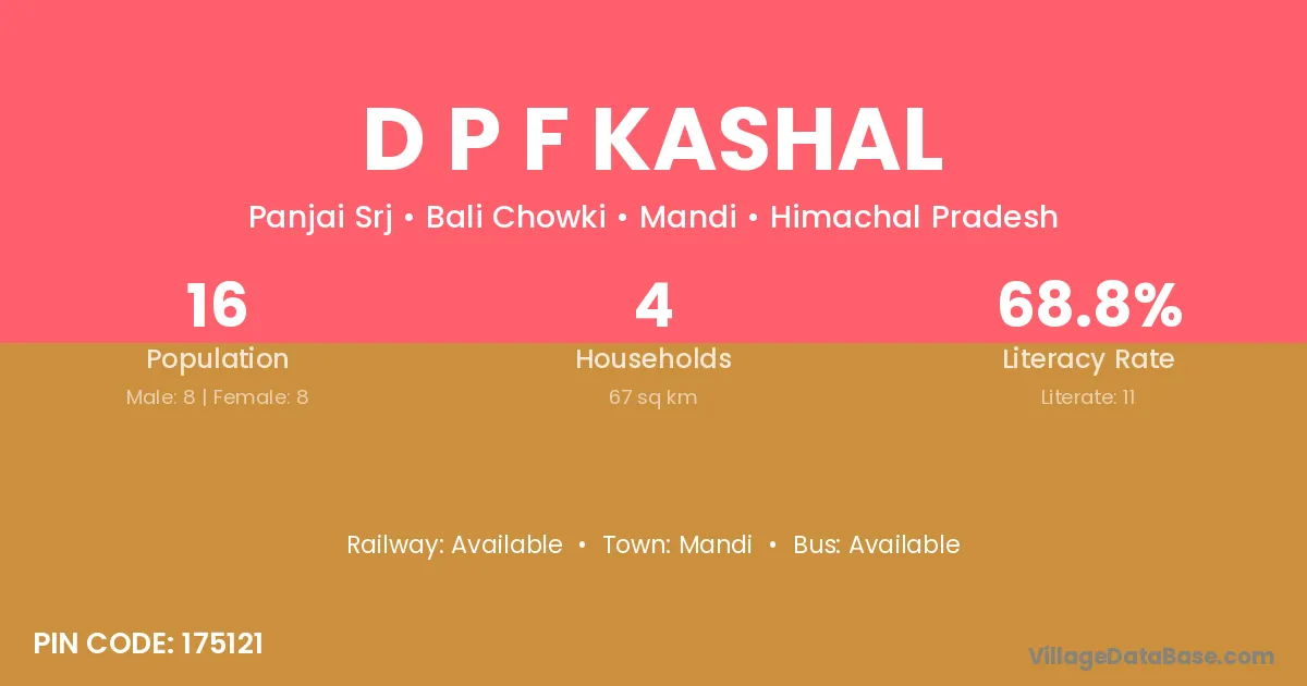 D P F Kashal village has a total population of 16 people, of which 8 are males and 8 are females.