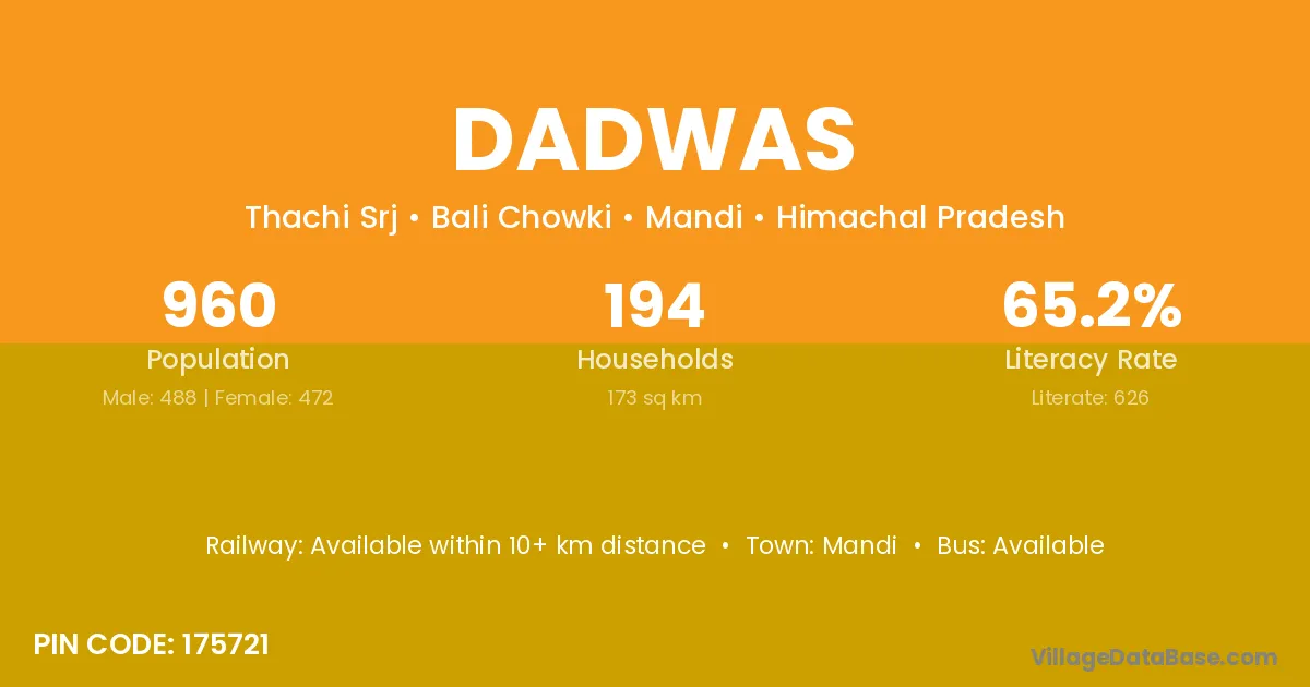 Dadwas village has a total population of 960 people, of which 488 are males and 472 are females.