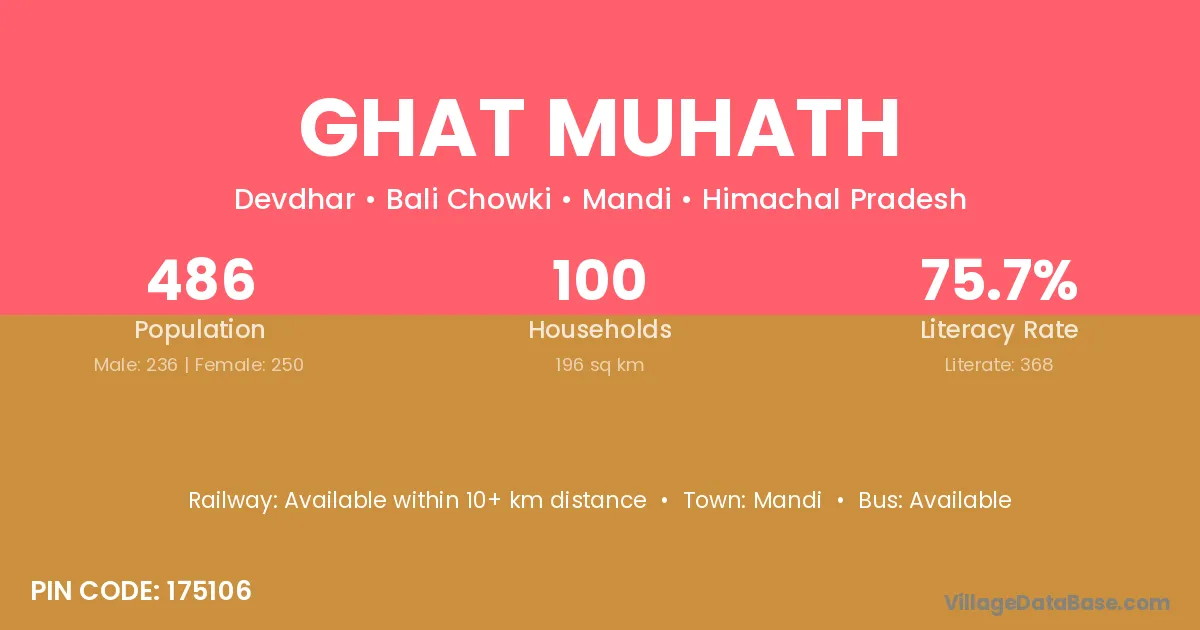 Ghat Muhath village has a total population of 486 people, of which 236 are males and 250 are females.