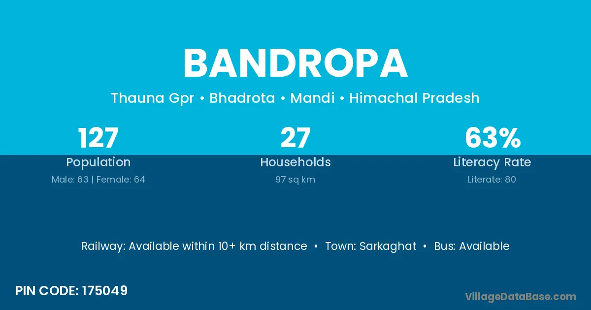 Bandropa village has a total population of 127 people, of which 63 are males and 64 are females.