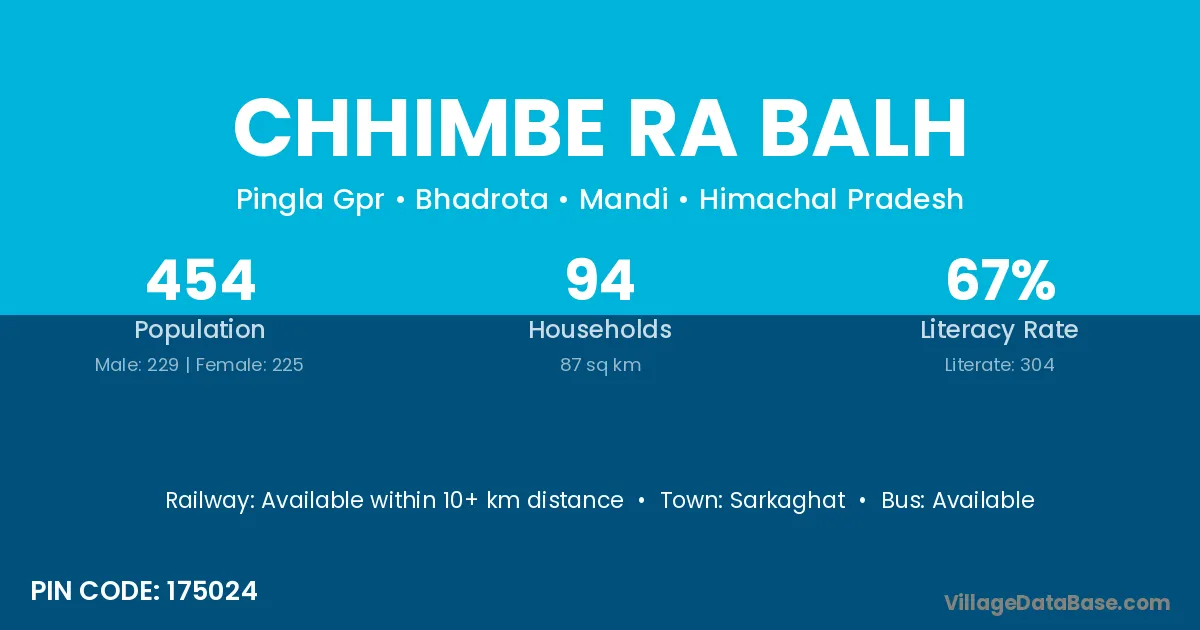 Chhimbe Ra Balh village has a total population of 454 people, of which 229 are males and 225 are females.