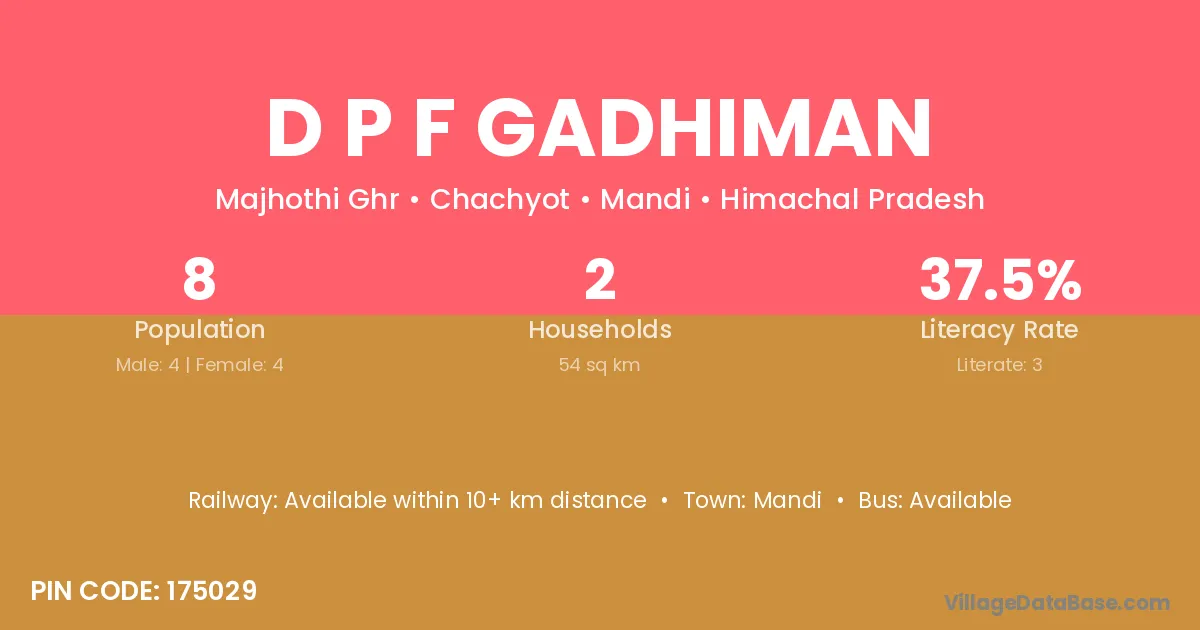 D P F Gadhiman village has a total population of 8 people, of which 4 are males and 4 are females.