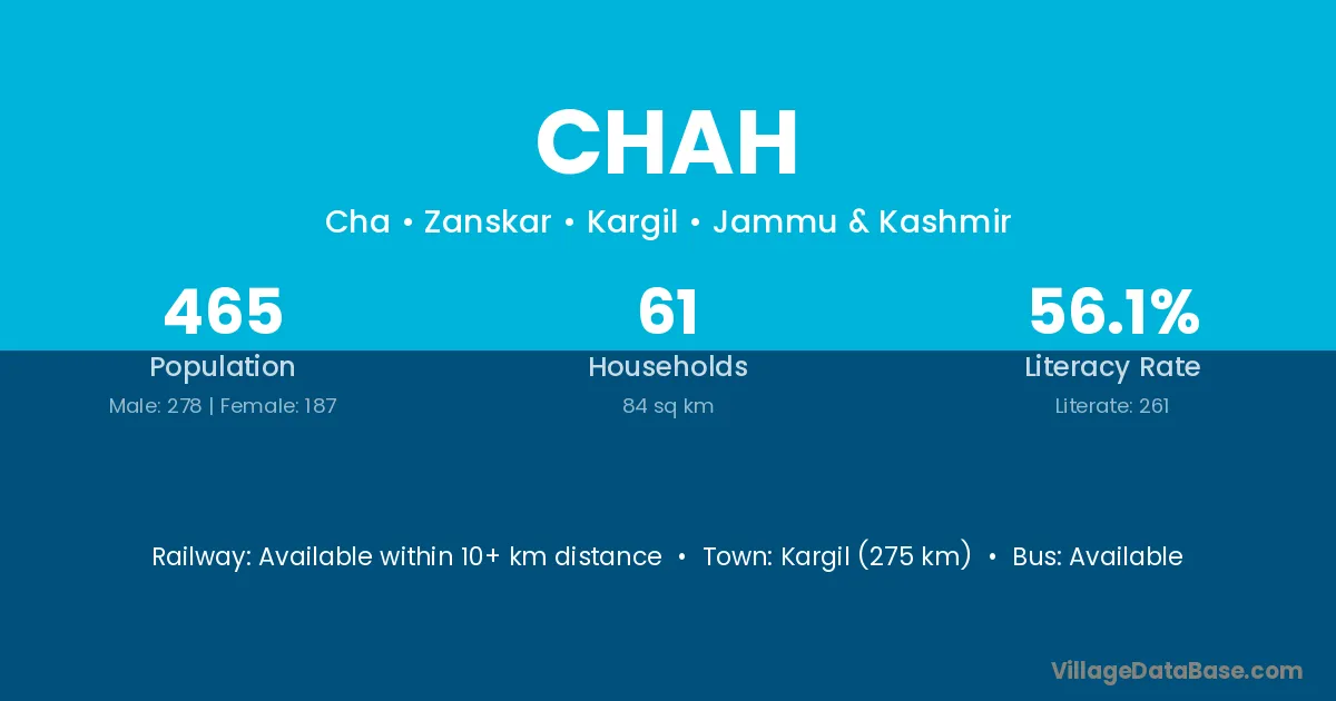The literacy rate of Chah village is 66.31%. Male literacy stands at 70.08% and female literacy at 63.16%.
