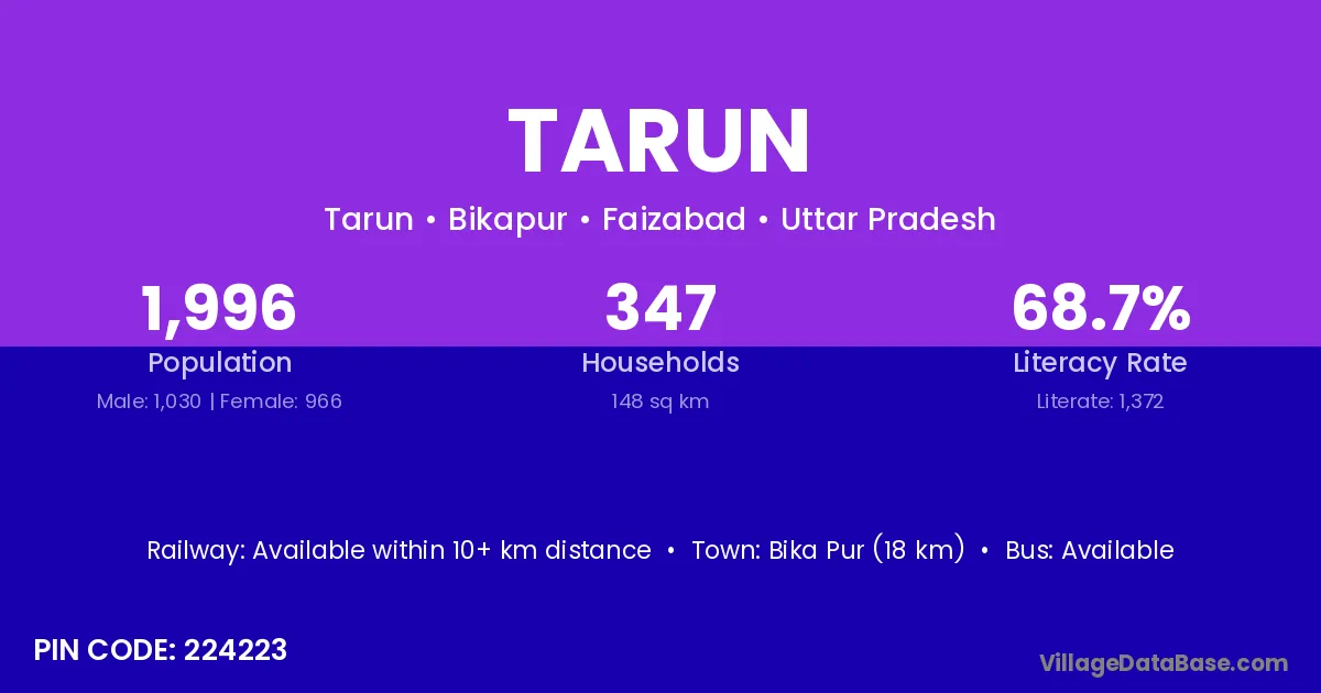 The literacy rate of Tarun village is 71.67%. Male literacy stands at 78.18% and female literacy at 65.96%.