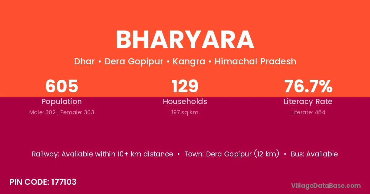 Bharyara village has a total population of 1,259 people, of which 634 are males and 625 are females.