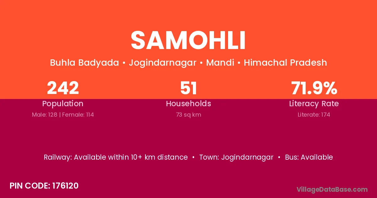 Samohli village has a total population of 242 people, of which 128 are males and 114 are females.