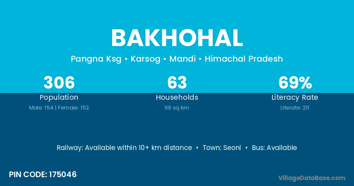 Bakhohal village has a total population of 306 people, of which 154 are males and 152 are females.