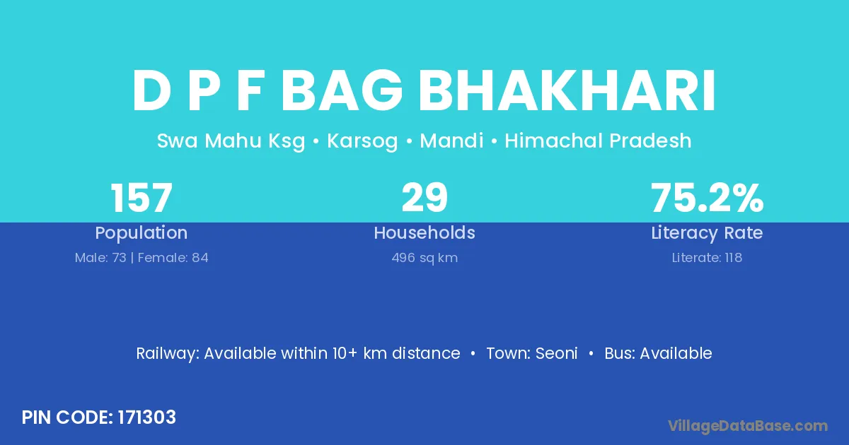 D P F Bag Bhakhari village has a total population of 157 people, of which 73 are males and 84 are females.