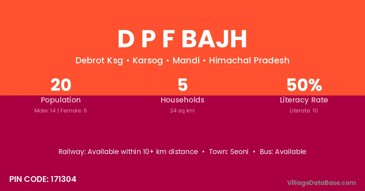 D P F Bajh village has a total population of 20 people, of which 14 are males and 6 are females.