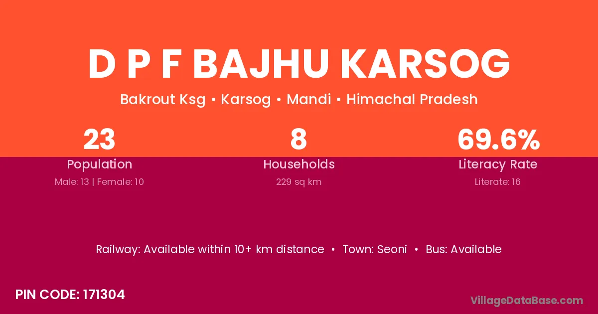 D P F Bajhu Karsog village has a total population of 23 people, of which 13 are males and 10 are females.