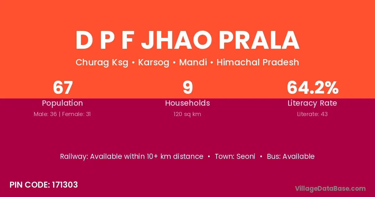 D P F Jhao Prala village has a total population of 67 people, of which 36 are males and 31 are females.