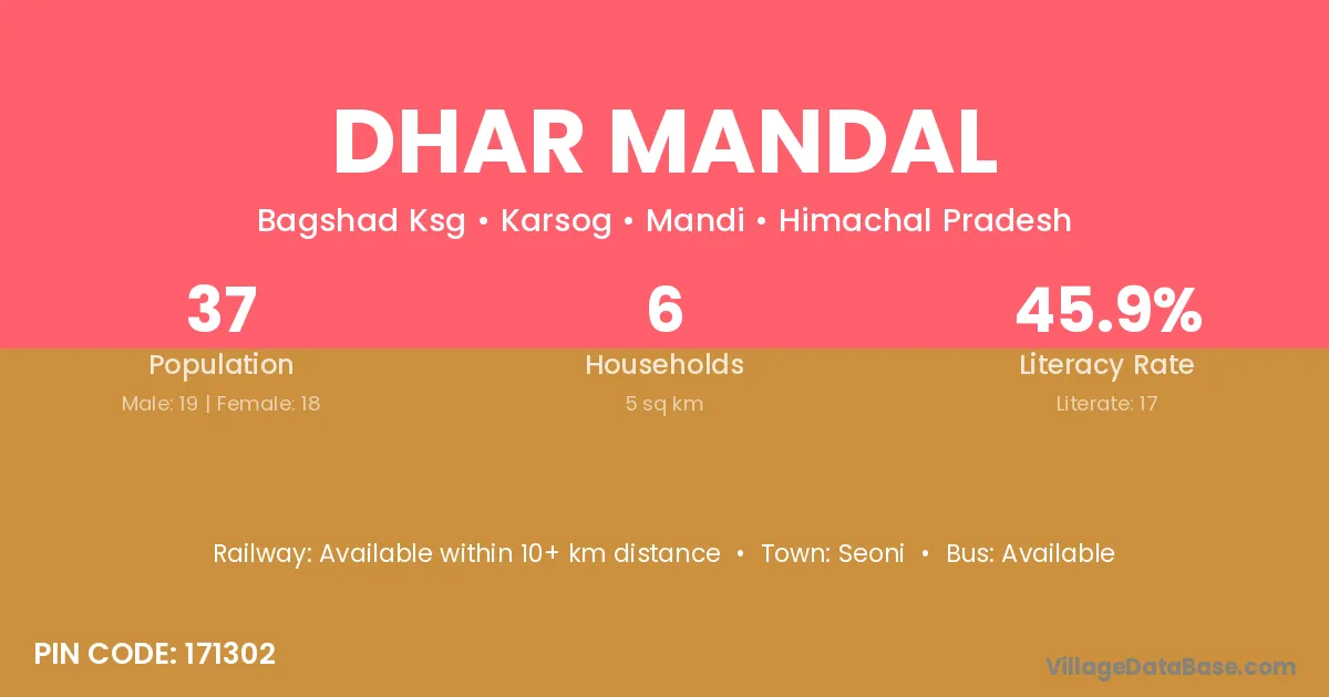 Dhar Mandal village has a total population of 37 people, of which 19 are males and 18 are females.