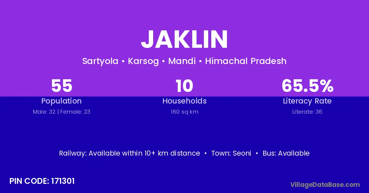 Jaklin village has a total population of 55 people, of which 32 are males and 23 are females.
