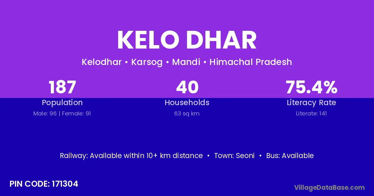 Kelo Dhar village has a total population of 187 people, of which 96 are males and 91 are females.