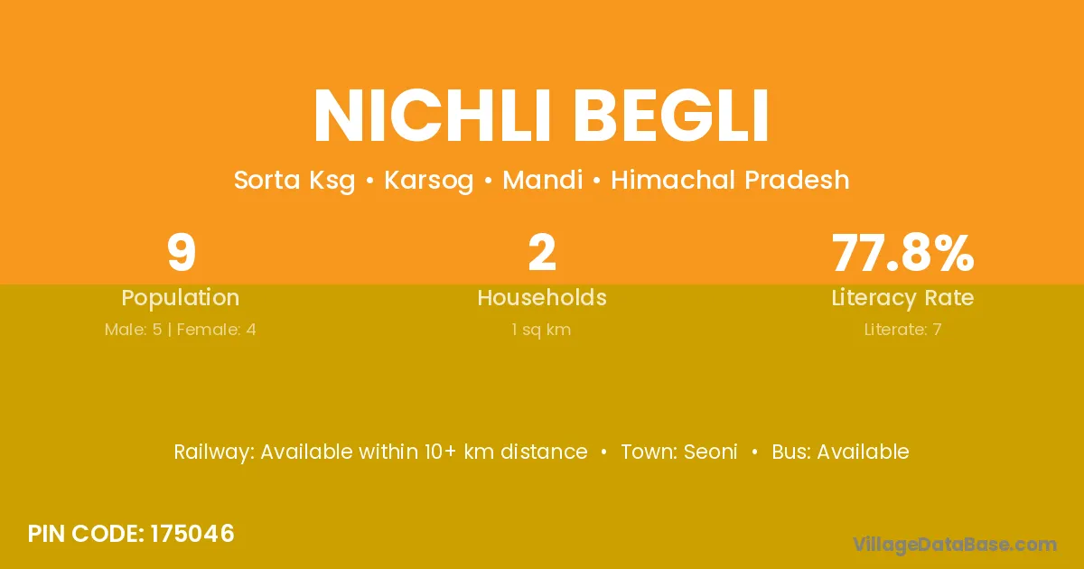 Nichli Begli village has a total population of 9 people, of which 5 are males and 4 are females.