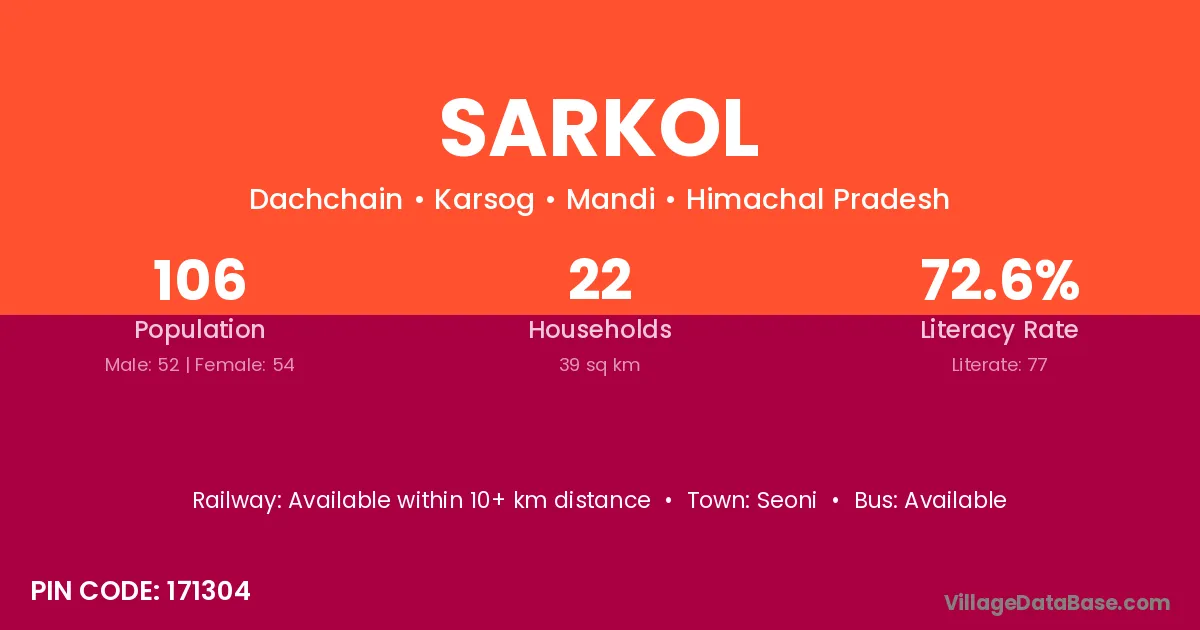Sarkol village has a total population of 106 people, of which 52 are males and 54 are females.