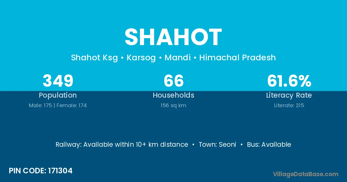 Shahot village has a total population of 349 people, of which 175 are males and 174 are females.