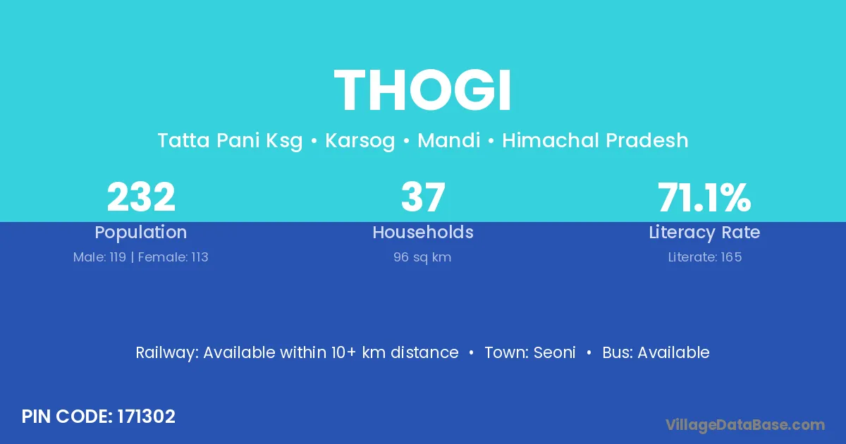 Thogi village has a total population of 232 people, of which 119 are males and 113 are females.