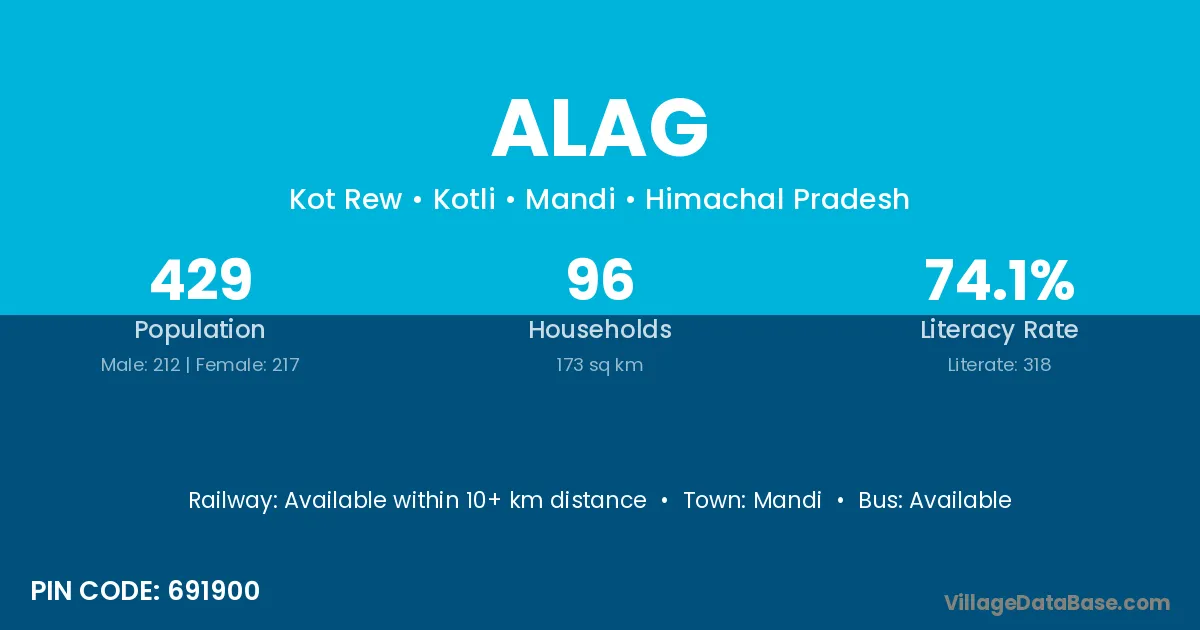 Alag village has a total population of 429 people, of which 212 are males and 217 are females.