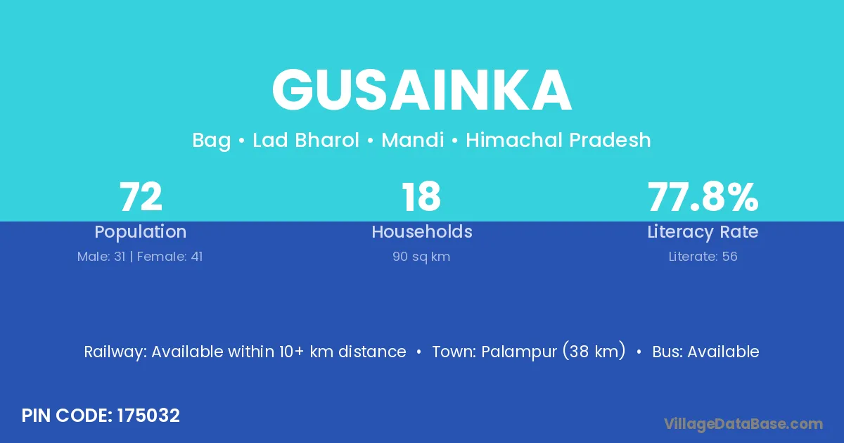 Palampur (38 km) is the nearest town to Gusainka village for major economic activities and is located approximately 38 km away.