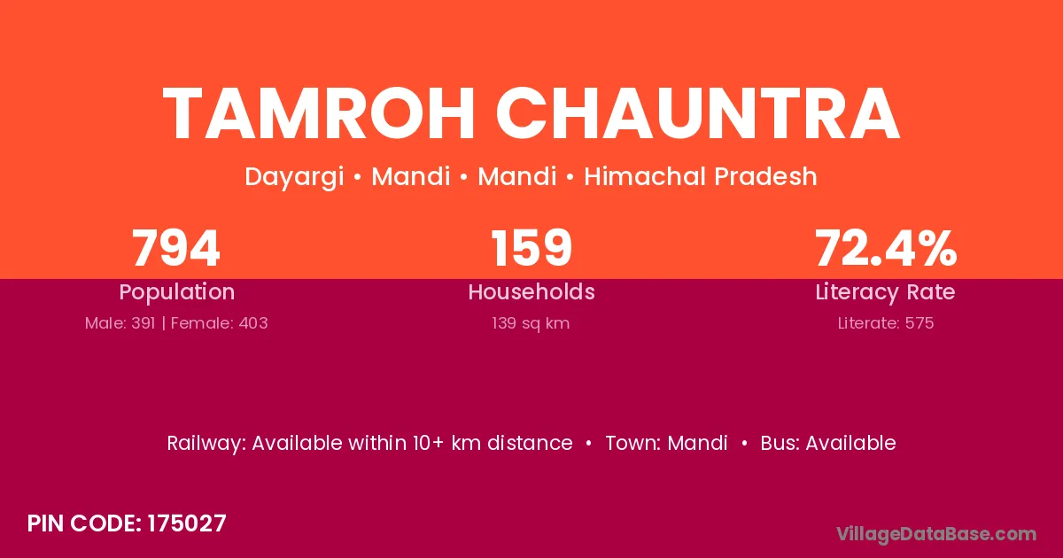 Tamroh Chauntra village has a total population of 794 people, of which 391 are males and 403 are females.