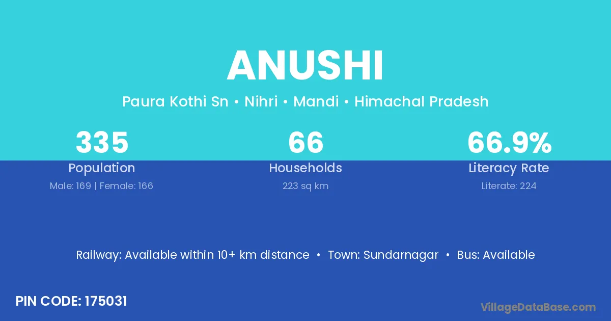 Anushi village has a total population of 335 people, of which 169 are males and 166 are females.