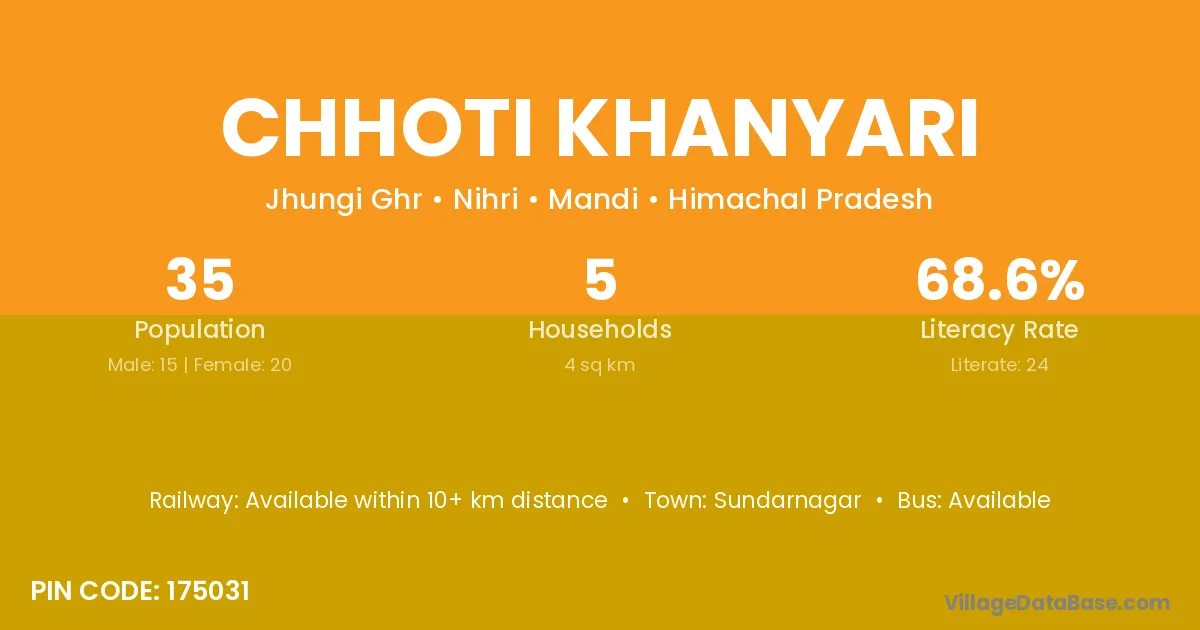 Chhoti Khanyari village has a total population of 35 people, of which 15 are males and 20 are females.