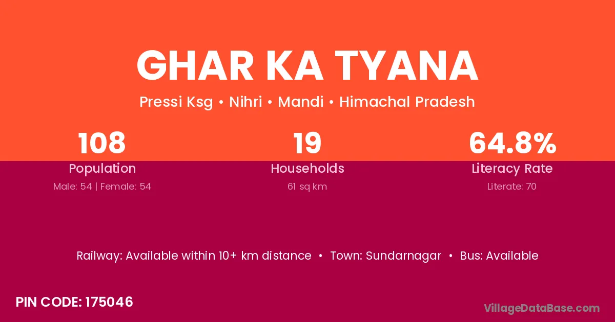 Ghar Ka Tyana village has a total population of 108 people, of which 54 are males and 54 are females.