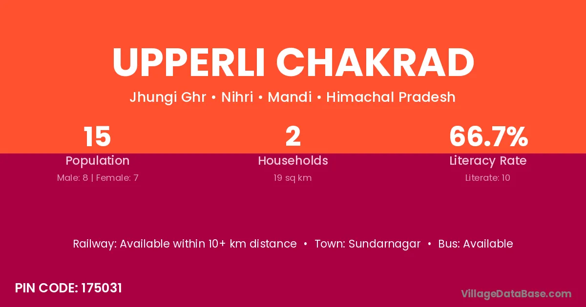 Upperli Chakrad village has a total population of 15 people, of which 8 are males and 7 are females.