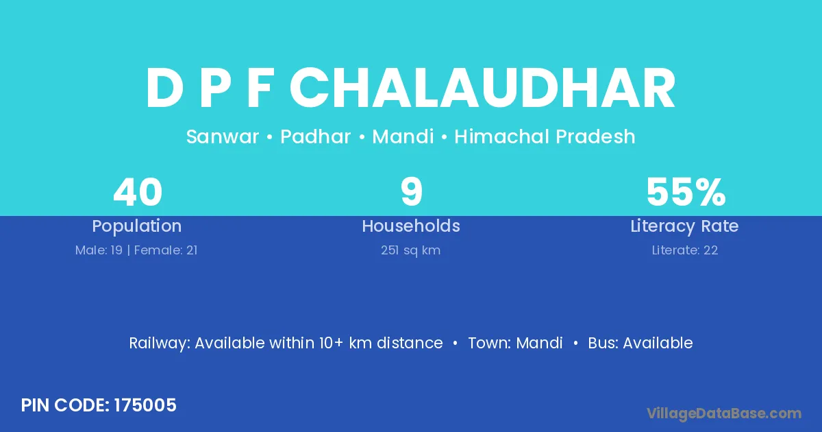 D P F Chalaudhar village has a total population of 40 people, of which 19 are males and 21 are females.