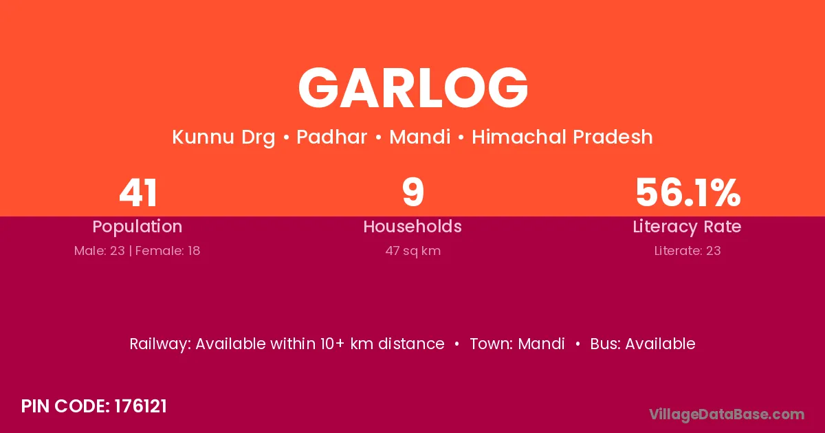 Garlog village has a total population of 41 people, of which 23 are males and 18 are females.