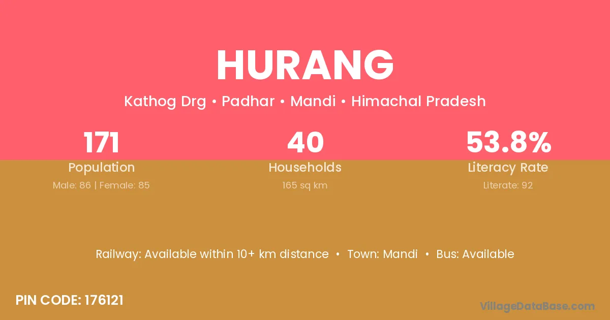 Hurang village has a total population of 171 people, of which 86 are males and 85 are females.