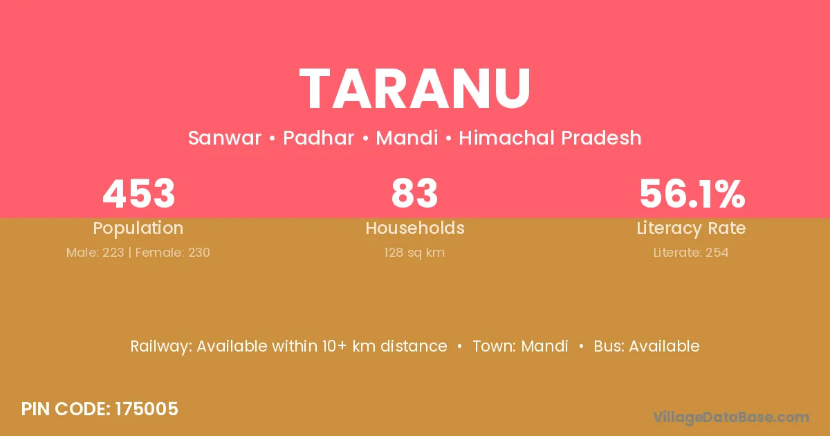 Taranu village has a total population of 453 people, of which 223 are males and 230 are females.
