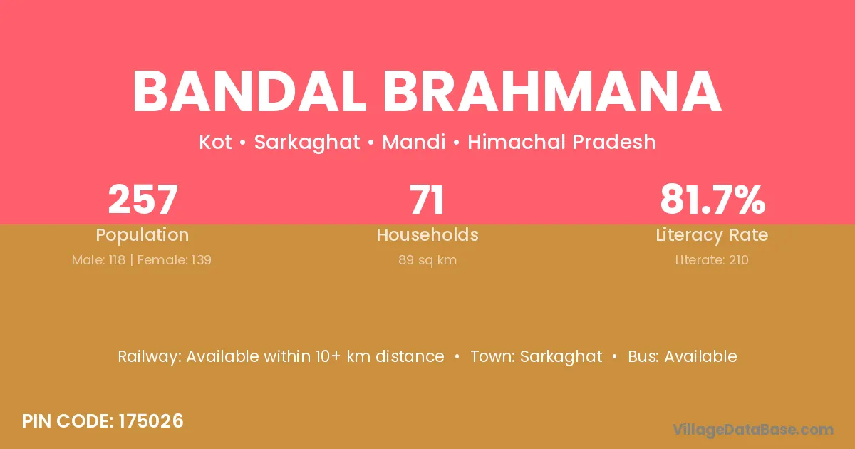 Bandal Brahmana village has a total population of 257 people, of which 118 are males and 139 are females.