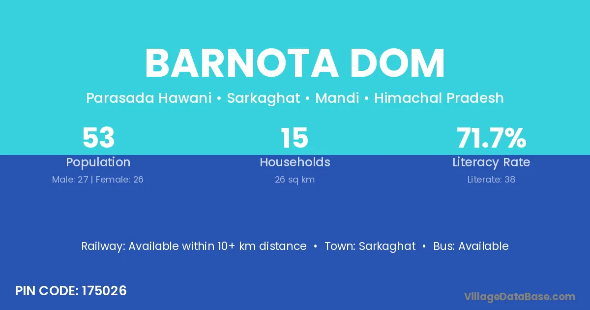 Barnota Dom village has a total population of 53 people, of which 27 are males and 26 are females.