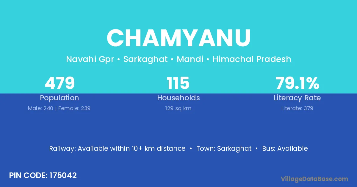 Chamyanu village has a total population of 479 people, of which 240 are males and 239 are females.