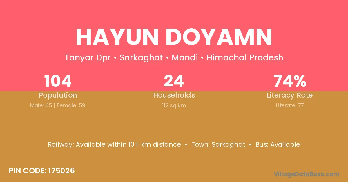 Hayun Doyamn village has a total population of 104 people, of which 45 are males and 59 are females.