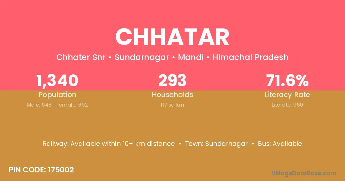Chhatar village has a total population of 1,340 people, of which 648 are males and 692 are females.