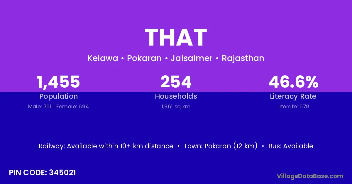The literacy rate of That village is 76.47%. Male literacy stands at 100.00% and female literacy at 63.64%.