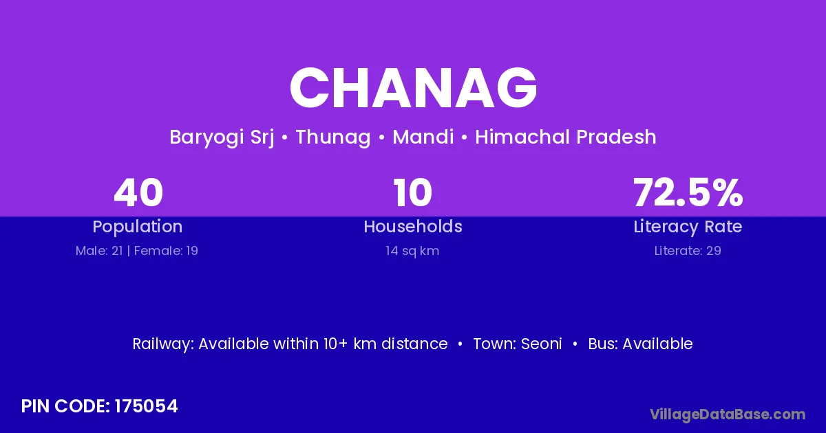 The literacy rate of Chanag village is 72.50%. Male literacy stands at 80.95% and female literacy at 63.16%.