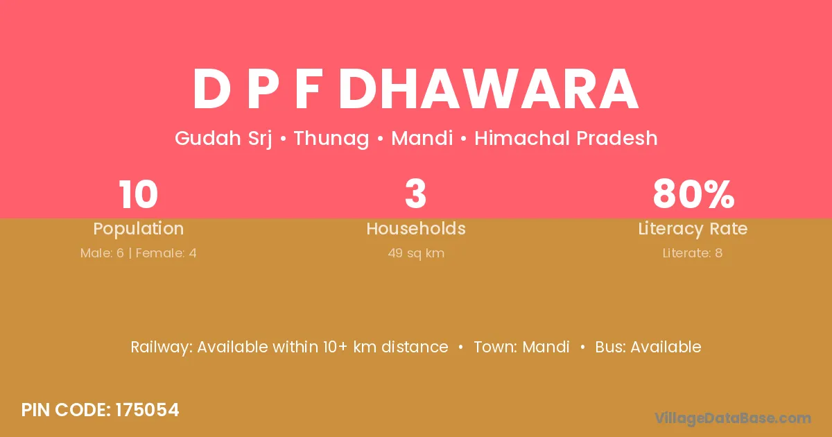 D P F Dhawara village has a total population of 10 people, of which 6 are males and 4 are females.