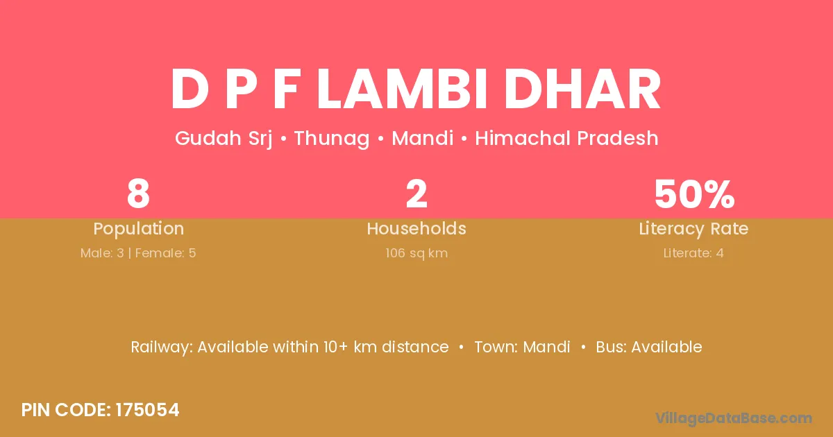 D P F Lambi Dhar village has a total population of 8 people, of which 3 are males and 5 are females.