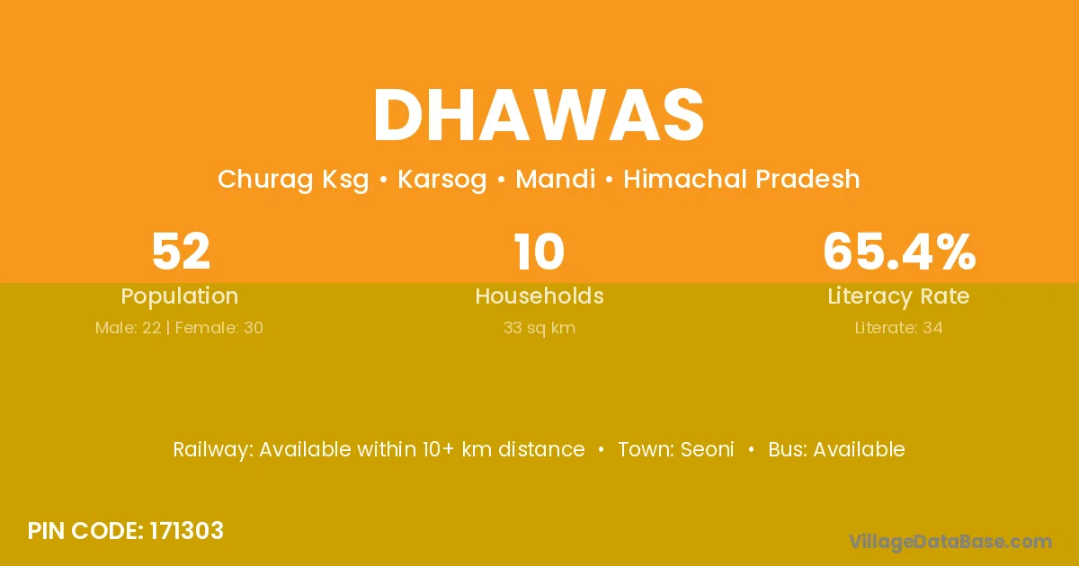 The literacy rate of Dhawas village is 56.67%. Male literacy stands at 62.26% and female literacy at 50.22%.