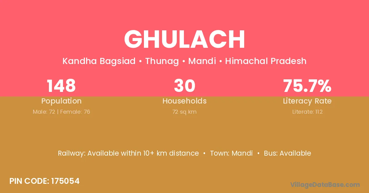 Ghulach village has a total population of 148 people, of which 72 are males and 76 are females.