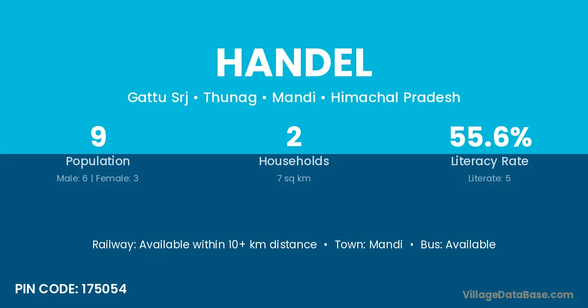 The literacy rate of Handel village is 55.56%. Male literacy stands at 50.00% and female literacy at 66.67%.