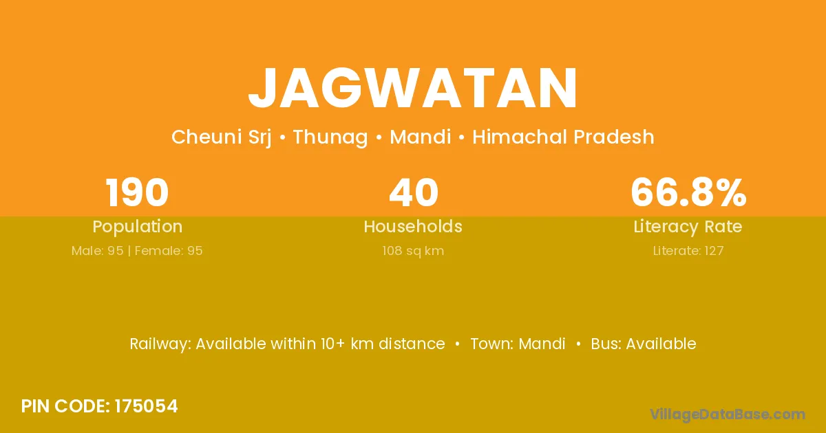 Jagwatan village has a total population of 190 people, of which 95 are males and 95 are females.