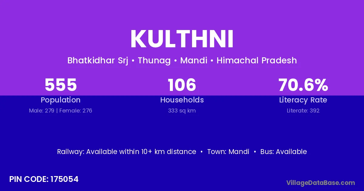 Kulthni village has a total population of 555 people, of which 279 are males and 276 are females.