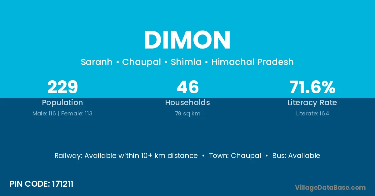 Dimon village has a total population of 229 people, of which 116 are males and 113 are females.